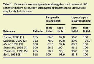 Der er publiceret flere sammenlignende undersøgelser mellem peroperativ kolangiografi og LUS og de vigtigste ses i Tabel 1. Der er således ikke forskel mellem PK og LUS, hvad angår diagnostik af choledochussten. Strålingsrisikoen ved PK må derfor betyde, at LUS primært må anbefales. LUS er god til screening af galdevejene for konkrementer, og LUS kan anvendes, men må stadig anses som værende mindre god til at kortlægge anatomiske variationer med, og må derfor suppleres med PK i tvivlstilfælde [10].