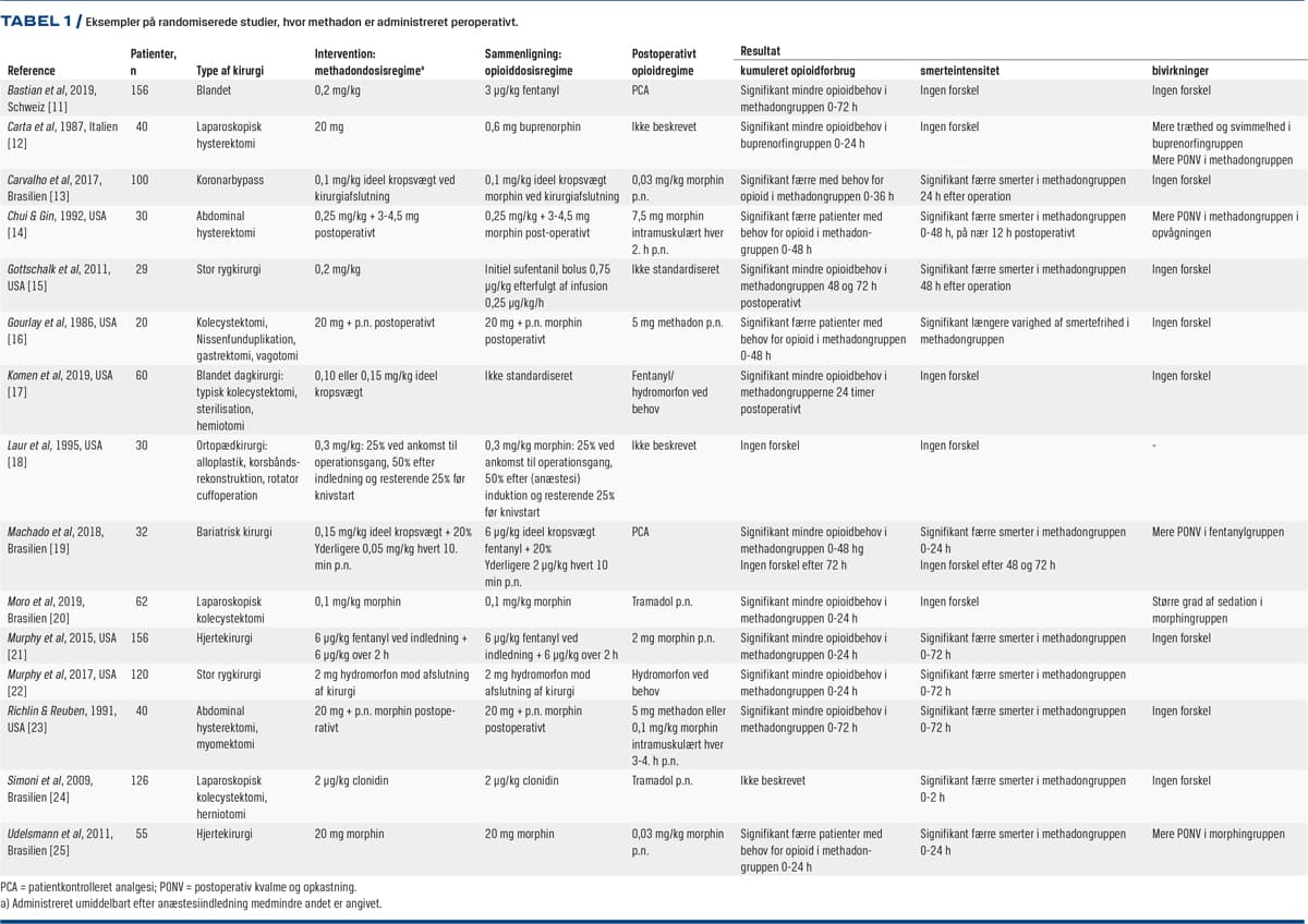 I Tabel 1 ses eksempler på randomiserede studier, hvor methadon er administreret peroperativt [11-25]. Hovedparten af studierne blev udført i USA eller Brasilien. Studierne varierer i størrelse fra 20 til 156 patienter og omhandler mange forskellige typer af kirurgi. Dosis af methadon var oftest 0,1-0,3 mg/kg indgivet intravenøst ved anæstesiindledningen. Kontrolgruppen fik i de allerfleste studier et andet opioid, oftest morphin. Langt de fleste studier påviste reduktion af opioidforbrug og/eller smerteintensitet. Reduktionen var i de fleste studier omkring 50% og mest udtalt i det første døgn. I flere studier sås effekt i op til 72 timer. Resultaterne af et enkelt, meget interessant studie tyder på, at peroperativ methadon kan reducere smerter og opioidforbrug i op til tre måneder [26].