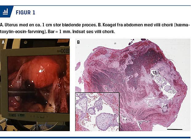 intraabdominalt. På bagvæggen af uterus mod venstre blev der fjernet en ca. 1 cm stor blødende proces (Figur 1A). En efterfølgende mikroskopi viste villi chorii med omgivende to lag cytotrofoblast og fokalt med flerkernet syncytiotrofoblast, hvilket var foreneligt med restvæv efter EUG (Figur 1B).