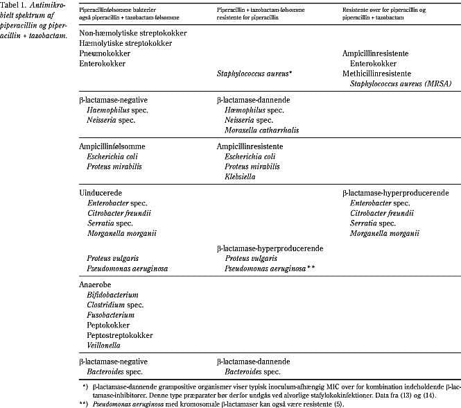 Piperacillin/tazobactam er det i Danmark senest registrerede antibiotikum, der kombinerer et kendt β -lactam-antibiotikum, piperacillin, med en b-lactamase-inhibitor, tazobactam. I forhold til piperacillin har kombinationen piperacillin/tazobactam et udvidet spektrum, der omfa tter ampicillinresistente Escherichia coli, Proteus vulgaris og Klebsiella samt methicillinfølsomme stafylokokker. Idet piperacillin i sig selv besidder aktivitet over for streptokokker, enterokokker og Pseudomonas aeruginosa, kan piperacillin/tazobactam udgøre et alternativ til de eksisterende antibiotika (3.-generations cefalosporiner og carbapenemer) ved empirisk behandling af komplicerede intraabdominale infektioner hos kritisk dårlige patienter samt ved empirisk behandling hos patienter med febrilia og akut neutropeni, hvilket kliniske undersøgelser synes at understøtte.