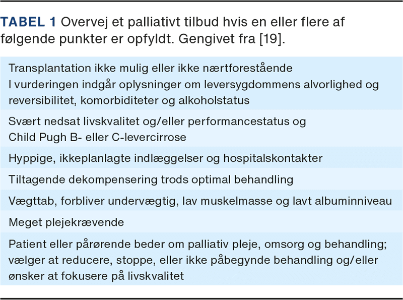 For at identificere patienter med behov for palliativ indsats anbefales at anvende redskabet Supportive and Palliative Care Indicators Tool (SPICT) [21]. I Tabel 1 findes en oversigt af SPICT tilpasset til patienter med levercirrose, fra Dansk Selskab for Gastroenterologi og Hepatologi. Oversigten støtter læger og sygeplejersker i identifikationen af de patienter med levercirrose, som bør tilbydes en palliativ indsats [19]. Patienter med dekompenseret levercirrose identificeres af SPICT, men også patienter med sarkopeni, hyppige indlæggelser eller stort plejebehov pga. cirrose eller komorbiditet kan have brug for palliativ indsats.