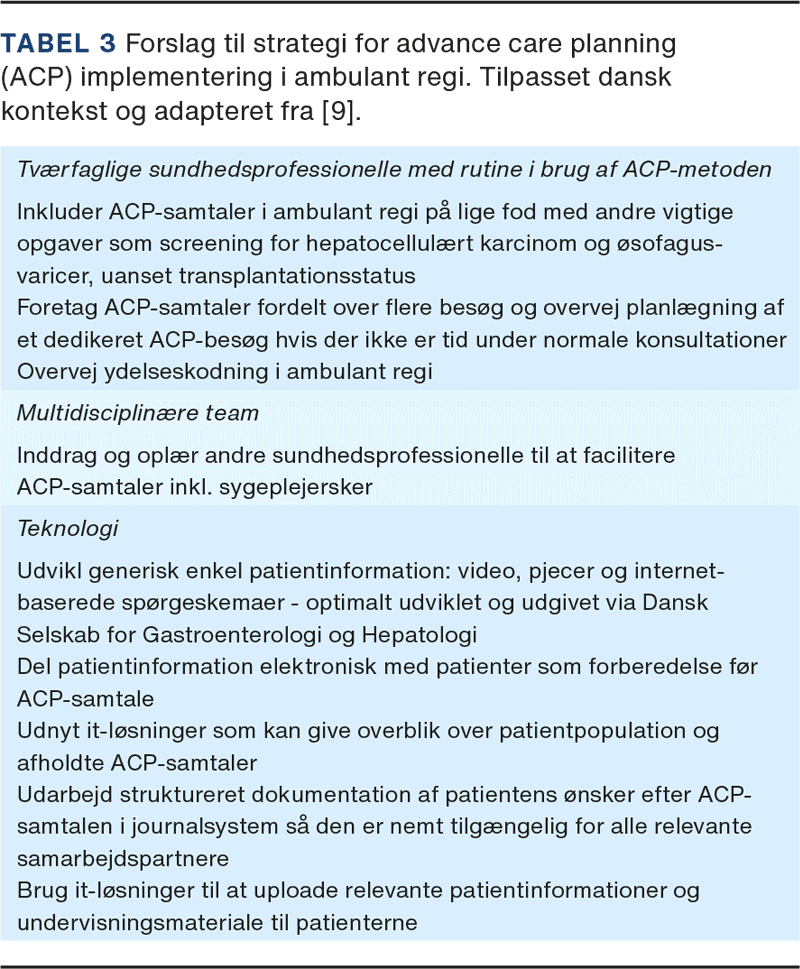 Patientrelaterede barrierer for anvendelse af ACP ved levercirrose er manglende forståelse for sygdomsforløbet, urealistiske forventninger til restlevetid og vanskelighed ved at tale om livets afslutning [9, 15]. Sundhedsprofessionelle beskriver barrierer i form af manglende undervisning og uddannelse i den svære samtale mod livets afslutning, en travl klinisk hverdag samt fokus på problemløsning, objektive behandlingsmål og levertransplantation [9]. Manglende uddannelse i palliation kan være årsag til forveksling mellem palliativ indsats og terminal pleje, ligesom usikkerhed ved at fastsætte prognose hos patienter med levercirrose vanskeliggør tidspunktet for påbegyndelse af tidlig og basal palliation [5]. I et enkelt studie har man adresseret mulighederne for at implementere ACP-samtaler på trods af de nævnte barrierer. Tabel 3 viser en tilpasset udgave af strategien [9].
