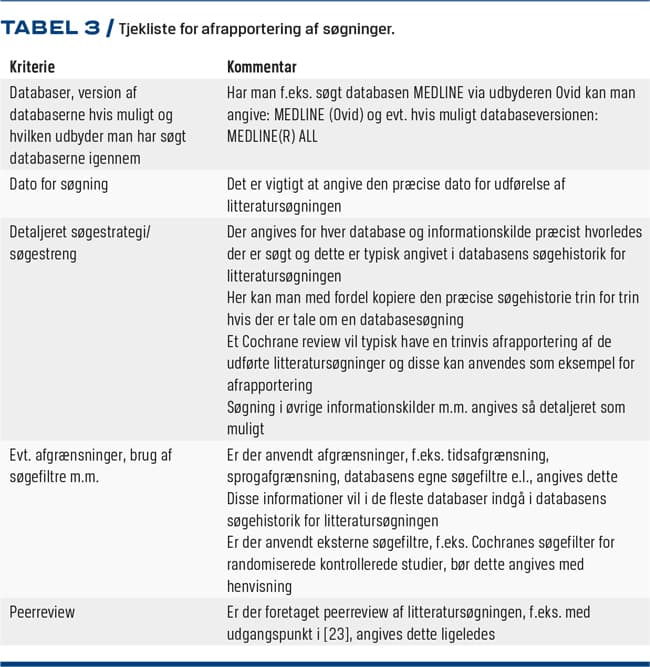 I nye anbefalinger lægges der vægt på en mere omfattende afrapportering af litteratursøgningen, der omfatter alle søgte databaser og informationskilder, og ikke blot afrapportering fra en enkelt database som tidligere [29]. PRISMA-Search (PRISMA-S) Extension er dedikeret til afrapportering af søgestrategier i systematiske review [30]. Denne tjekliste indikerer vigtige elementer af litteratursøgningen, som bør afrapporteres(Tabel 3).