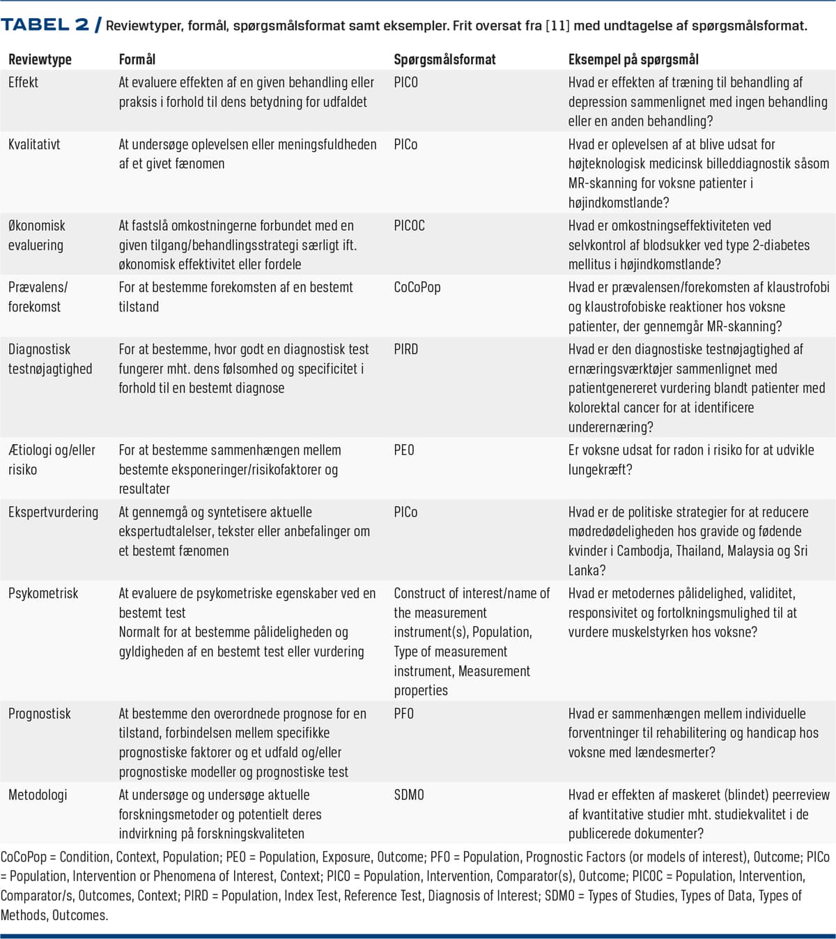 I Tabel 2 vises en oversigt over en række forskellige reviewtyper og dertilhørende format for formulering af forskningsspørgsmål. Listen skal ikke betragtes som udtømmende, da mange andre reviewtyper er identificeret [12], men den skal tjene som inspiration.