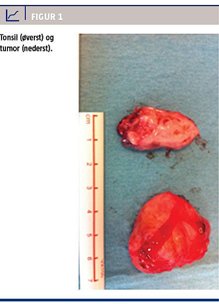På mistanke om peritonsillær absces blev der punkteret i det peritonsillære væv. Der kom lidt grødet materiale iblandet blod. Der blev nu påbegyndt antibiotikabehandling, og næste dag blev der ved klinisk kontrol foretaget nye punkteringer, hvor den formodede peritonsillære absces havde gendannet sig. Da punkteringen ikke havde en overbevisende effekt, og patientens symptomer var uændrede, blev der foretaget tonsillektomi. I det højre tonsilleje fandtes en stor tumor (4,5 × 2 × 1 cm) (Figur 1) lateralt for tonsillen. Tumoren blev makroskopisk fjernet in toto.
