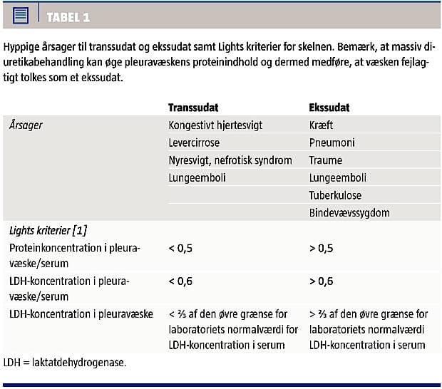 Pleuraeffusion er en ansamling af væske i cavum pleurae. Traditionelt skelnes der mellem ekssudat (forhøjet kapillær permeabilitet eller lymfatisk obstruktion) og transsudat (forhøjet hydrostatisk tryk), hvilket vurderes ved koncentrationer af hhv. protein og laktatdehydrogenase (Tabel 1) [1, 2]. Ved pleuracentese (torakocentese) udhentes væske diagnostisk og/eller terapeutisk (Figur 1).