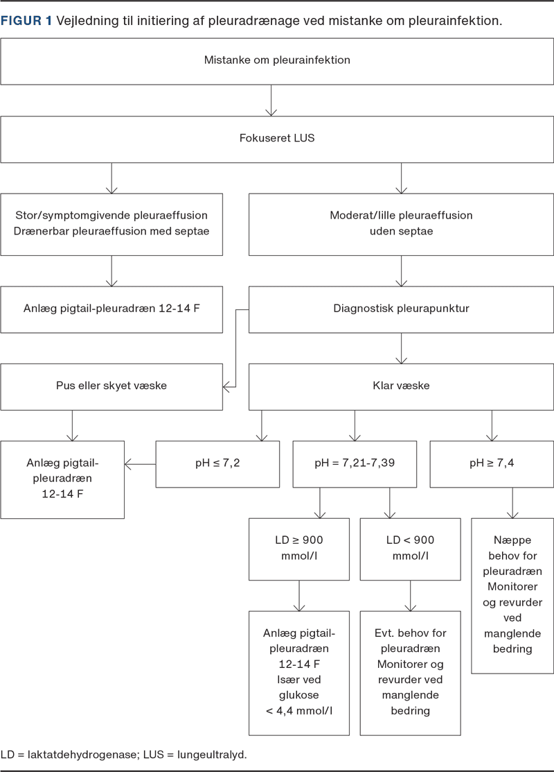 Inficerede patienter med pleuraeffusion bør udredes og afklares subakut mhp. mulig infektion (se Figur 1), idet > 24 t. forsinkelse af drænage af pleurainfektion har betydning for mortalitet [9]. Initial udredning bør derfor kunne varetages i enhver akutmodtagelse og i afdelinger inden for de internmedicinske specialer. Udredning indebærer lunge-UL-skanning (LUS), CT af thorax samt diagnostisk aspiration af pleuravæske, som sendes til en klinisk biokemisk afdeling (til måling af glukoseniveau, LD og protein samt leukocyt- og differentialtælling), pH-niveaumåling i blodgasapparat (obs.: Kun klar pleuravæske!) samt mikroskopi og dyrkning og resistensbestemmelse (D+R) i spidsglas og D+R i aerobe samt anaerobe dyrkningskolber [2, 3]. Som ved andre infektioner øges sensitivitet for identifikation af mikrobiologisk agens, hvis pleuravæske tages fra til dyrkning inden opstart af behandling med antibiotika [13].