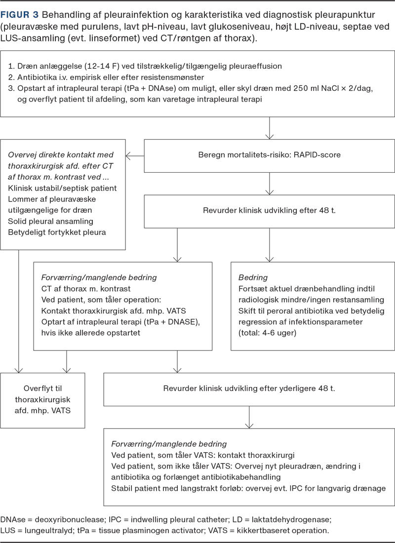 Den initiale behandling af pleurainfektion bør opstartes subakut (Figur 3). Specialiseret behandling bør varetages af lungemedicinsk afdeling i samarbejde med den lokale mikrobiologiske, infektionsmedicinske og thoraxkirurgiske afdeling. Effektiv pleuradrænage og målrettet antibiotika er afgørende for succesfuld behandling, og der er god evidens for, at tidlig opstart af denne behandling forkorter indlæggelsestid, mindsker behovet for åben kirurgi og reducerer senkomplikationer [20].