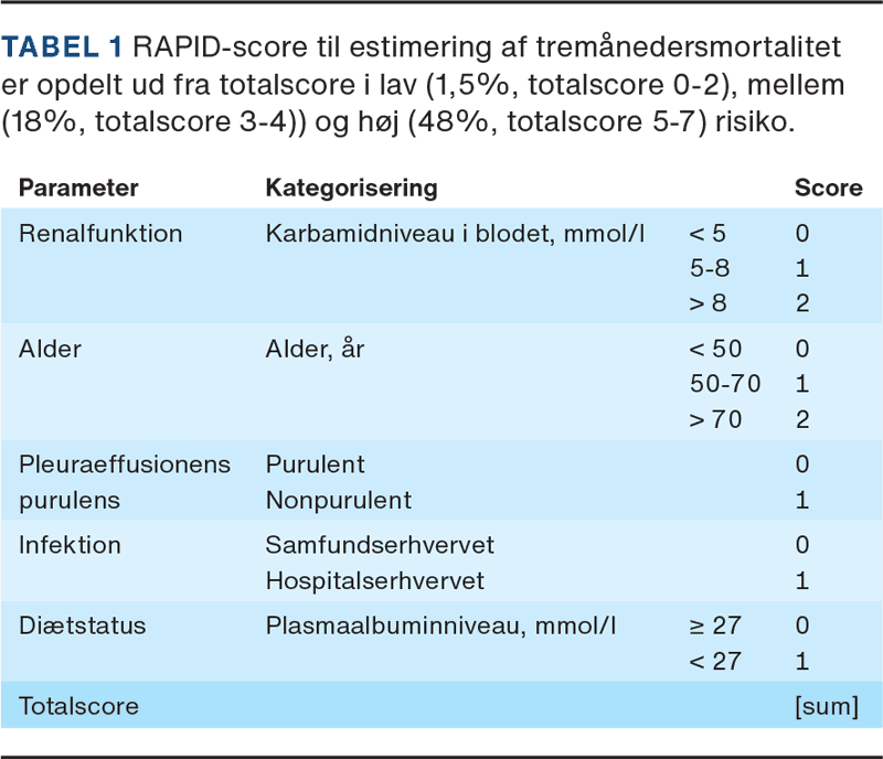 Pleurainfektion er i forbundet med en etårs mortalitet på 20%, men dette tal dækker over en etårsmortalitet på 35% hos ældre eller immunsupprimerede [2]. I et dansk studie var tremåneders mortaliteten 13% [9]. Mortalitetsrisikoen kan bestemmes ved måling af RAPID-score (se Tabel 1), et valideret redskab til at estimere tremåneders mortalitetsrisiko (lav = 1,5%; mellem = 18%; høj = 48%) [10, 11]. RAPID tager udgangspunkt i fem faktorer: nyrefunktion, alder, pleuravæskepurulens, hospitals-/samfundserhvervet infektion og plasmaalbumin. Klinikere kan bruge RAPID til identifikation af risikopatienter. Et nyere retrospektivt studie indikerer, at RAPID muligvis bidrager til identifikation af patienter, der har gavn af tidlig kirurgisk intervention, men validering ved et prospektivt studie savnes [12].
