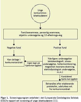 ESC's rapport om screening af unge idrætsudøvere [1] er baseret på erfaringer fra Italien og munder ud i en anbefaling af et screeningsprogram (Figur 1 ). Man anbefaler, at alle idrætsudøvere, som deltager i konkurrenceidræt, screenes hvert andet år fra de er 12-14 år til de er 35 år.
