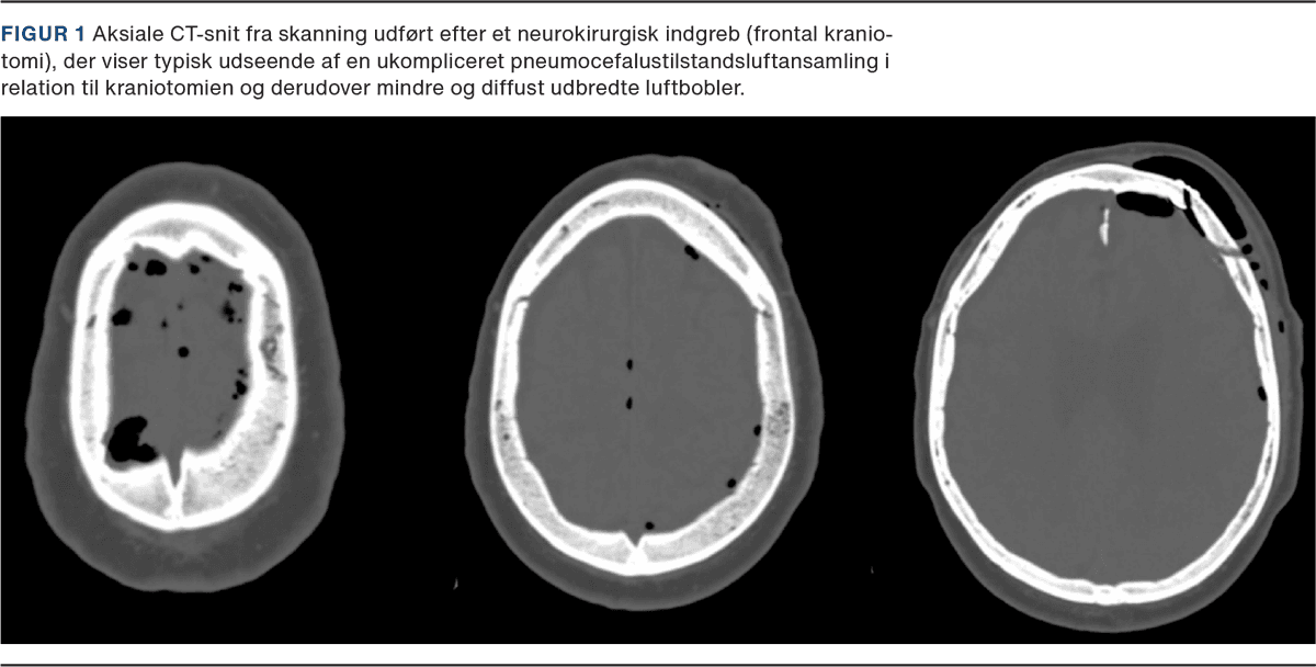 Neurokirurgiske indgreb anses for at være en af de hyppigste årsager til pneumocefalus [11, 12]. Dette er en naturlig følge af, at der ved disse operationer er behov for åbning af dura for at kunne behandle en underliggende patologi i hjerne eller rygmarv, hvilket medfører en eksponering for atmosfærisk luft. Subdural lokalisation af luften er den hyppigste (Figur 1), men afhængigt af indgrebet kan luft forekomme i alle intrakranielle kompartmenter [13, 14].
