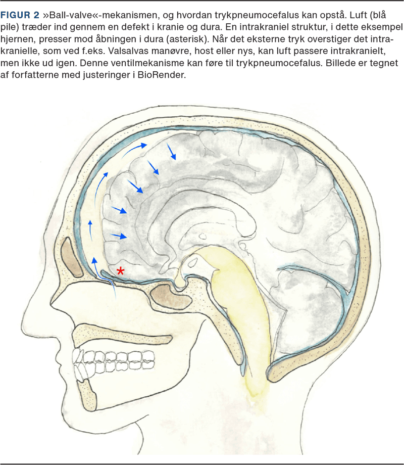 1) »Ball-valve«-mekanismen: Luft kan passere intrakranielt grundet et ekstrakranielt overtryk, f.eks. hoste, nys eller overtryksventilation, men grundet en ventilmekanisme fra intrakranielt væv lukkes åbningen, så luften ikke kan slippe ud igen (Figur 2). Denne mekaniske blev beskrevet af Walter Dandy allerede i 1926 [1].