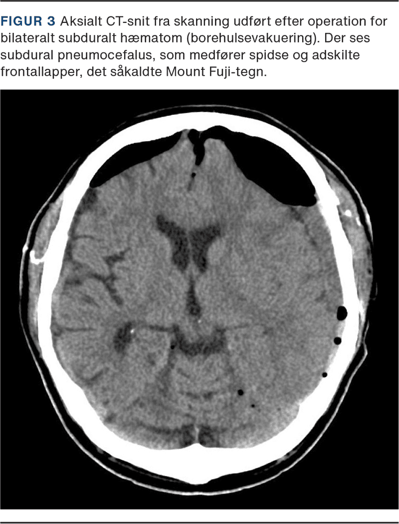 Trykpneumocefalus defineres som intrakraniel luft, der udøver masseeffekt på hjernen og kan medføre forhøjet ICP med dertilhørende symptomer, som inkluderer hovedpine, kvalme/opkastning, motorisk uro, fokale neurologiske udfald, f.eks. kranienervepåvirkning, kramper samt faldende bevidsthedsniveau og ultimativt død [9, 17, 18]. Trykpneumocefalus er beskrevet i forbindelse med mange af de tidligere nævnte ætiologier, herunder efter forskellige neurokirurgiske procedurer, traumer og spontant [9, 17-20]. Mortaliteten for ubehandlet trykpneumocefalus er ukendt, men må antages at være høj [20]. Trykpneumocefalus kan tænkes at opstå både som følge af en ventilmekanisme og som følge af udtalt CSV-lækage som tidligere beskrevet [9]. Et radiologisk fund, som kan ses ved trykpneumocefalus, er Mount Fuji-tegnet, hvor frontallapperne på aksiale CT eller MR-snit fremstår spidse, sammenpressede og adskilte ved frontalpolen, hvilket giver et udseende, der minder om den kendte bjergsilhuet (Figur 3). Det er dog vigtigt at pointere, at både sensitivitet og specificitet er relativt lav, så ikke alle patienter med trykpneumocefalus udviser dette tegn, og at ikke alle patienter med Mount Fuji-tegn har trykpneumocefalus [20].