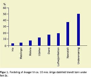 I udviklingslandene dør hvert år mellem 10 og 11 millioner børn under fem år af sygdomme, der for hovedpartens vedkommende kan forebygges eller er relativt lette at behandle (Figur 1 ). Cirka 20% af dødsfaldene skyldes pneumoni, og mere end en tredjedel af pneumonierne er forårsaget af Streptococcus pneumoniae [1]. Ud over pneumoni er Streptococcus pneumoniae også årsag til meningitis, sepsis og otitis media, og det skønnes, at mindst 800.000 børn under fem år dør af pneumokokinfektion årligt. Patienter, som overlever invasiv pneumokokinfektion, har ofte sequelae i form af høretab, neurologisk handicap, indlæringsvanskeligheder og retarderet udvikling.