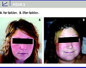 Under pressefasen hævede patientens ansigt og hals pludseligt op. Øjenomgivelserne »poppede op«, så hun ikke kunne se, og hævelserne forværredes for hvert pres (Figur 1 ). Hun blev bange for at presse af frygt for, at hævelserne skulle blive værre, og blev derfor forløst med episiotomi og vakuumekstraktion.