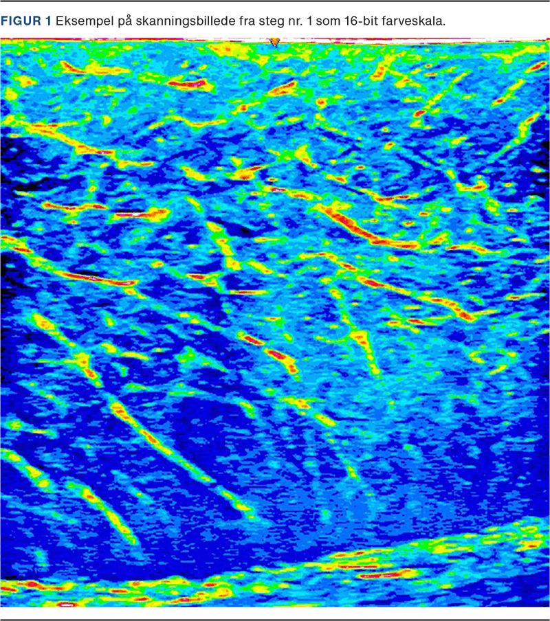 Efter UL-skanning af stegene havde steg nr. 1 64,26% væskeholdigt kød, steg nr. 2 havde 58,15% væskeholdigt kød, og steg nr. 3 havde 60,33% væskeholdigt kød. Ved steg nr. 3 var begge skanninger i yderste inddeling væsentligt forskellige fra de andre, og ved inspektion af skanningsbillederne var der artefakter på begge billeder. Derfor blev disse billeder fjernet fra analysen, og andelen af væskeholdigt kød blev beregnet. Eksempel på skanningsbillede i 16-bit farveskala ses i Figur 1.