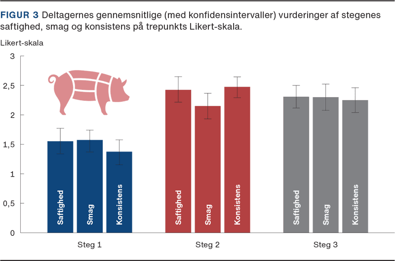 Deltagernes gennemsnitlige vurderinger (Figur 4) stemte overens med, hvilke stege deltagerne overordnet set helst ville spise. Steg nr. 1 havde en gennemsnitlig totalscore på 4,5 og fik kun to stemmer, mens steg nr. 2 havde en gennemsnitlig totalscore på 7,1 og fik 20 stemmer, og steg nr. 3 havde en gennemsnitlig totalscore på 6,9 og fik 18 stemmer.