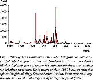 Forekomsten af børnelammelse i Danmark forløb parallelt med forekomsten i resten af Europa. Sporadiske tilfælde af polio er beskrevet så tidligt som i 1860, men landet var forskånet for epidemier indtil 1934. I løbet af de næste 30 år fulgte flere epidemier med den absolut største i 1952-1953 med 3.145 registrerede tilfælde af paralytisk polio og 4.122 registrerede tilfælde af aparalytisk polio (Fig. 1). Netop denne epidemi var årsagen til, at man i Danmark påbegyndte vaccinationerne meget tidligt.