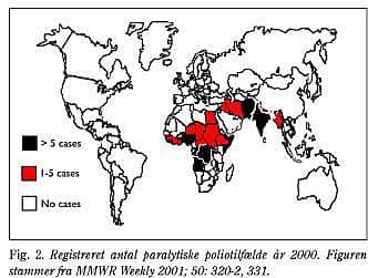 Som anført er polio desværre endnu ikke udryddet på verdensplan. Nye tilfælde af polio dukker stadig op på det afrikanske og det sydøstasiatiske kontinent. I 1999 registrerede man 7.141 nye tilfælde af paralytisk polio fordelt på 30 lande, i år 2000 var dette tal faldet til 2.610 (Fig. 2). Registreringen er dog endnu ikke fuldstændig, hvorfor tallene formentlig er en del højere. At der stadig forekommer polio i lande som Indien, Pakistan, Bangladesh, Nigeria og Etiopien, skyldes en kombination af overbefolkning, lav rutinevaccinationsdækning og dårlige levevilkår. En anden alvorlig trussel mod udryddelsen af polio er krig og andre konflikter, som betyder, at vaccinationsprogrammer og sygdomsovervågning ikke kan gennemføres. Især lande som Afghanistan, Angola, Congo, Somalia og Sudan har været berørt af disse problemer (11).