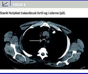 Spirometri afslørede en obstruktiv lungefunktionsnedsættelse med forceret ekspiratorisk volumen i første sekund (FEV1 ) på 62 % af det forventede - på trods af at patienten aldrig havde røget. Flowvolumenkurven viste udtalt dynamisk kompression under ekspiration, men et normalt inspiratorisk mønster. Computertomografi af thorax viste trakeobronkial stenosering med udtalt fortykkelse af luftvejsbrusken samt knogleerosioner svarende til sternokostalleddene(Figur 1 ). Efterfølgende bronkoskopi afslørede koncentrisk forsnævrede forhold omkring trakea samt begge hovedbronkier.