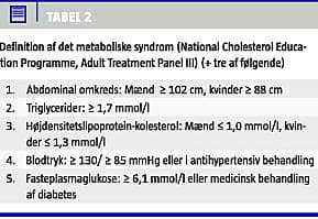 Det MS omfatter en kombination af IR, hypertension, dyslipidæmi (øget triglycerid og reduceret højdensitetslipoprotein (HDL)-kolesterol), glukoseintolerance, abdominal fedme og/eller øget body mass index (BMI). I modsætning til PCOS er der ikke konsensus omkring definitionen. Ifølge de diagnostiske kriterier, der er fastsat af The National Cholesterol Education Program Adult Treatment Panel (NCEP-ATP III) fra 2003 (Tabel 2 ) opfattes abdominal fedme og fysisk inaktivitet med IR som de væsentligste patofysiologiske faktorer med et klinisk udtryk, der i høj grad er betinget af den genetiske disposition [4].