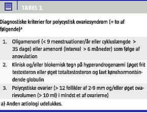 De i dag anvendte diagnostiske kriterier for PCOS (Tabel 1 ) blev udfærdiget af The Rotterdam ESHRE/ASRM-Sponsered Consensus Workshop Group 2003 som et kompromis mellem den tidligere foretrukne europæiske diagnostik med hovedvægt på ultralyd og de diagnostiske principper i USA, hvor man tilskrev kronisk anovulation og biokemiske ændringer større klinisk betydning [3].