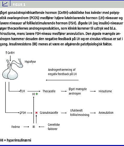 Mange mekanismer i udviklingen af PCOS er endnu ikke klarlagte. Overordnet set kan hyperinsulinæmi (HI) samt en lokal IR i ovarierne forklare den øgede ovarielle androgenproduktion og dermed udviklingen af de kliniske manifestationer i syndromet [3]. HI virker synergistisk med lutiniserende hormon (LH) under stimulation af theca-cellernes androgensyntese, hvorved den ovarielle sekretion af androstendion og testosteron øges. Endvidere hæmmes syntesen af det kønshormonbindende globulin (SHBG), hvilket medfører en stigning i frit cirkulerende androgen. Øget udskillelse af LH fra hypofysen opfattes som en kompensatorisk følge af en nedsat ovariel LH-effekt pga. lokal IR i ovariet og en androgeninduceret desensibilisering for progesteron på hypotalamus/hypofyseniveau. På denne måde øges LH/follikelstimulerende hormon (FSH)-ratio, og i samspil med det abnorme intraovarielle endokrine miljø dannes det øgede antal umodne (præantrale) follikler i ovarierne [5] (Figur 1 ).