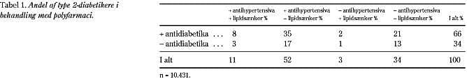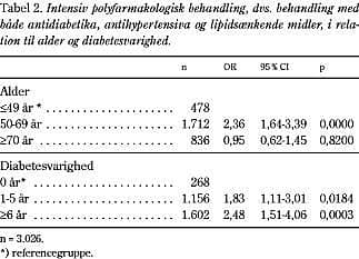 Tabel 1 viser, hvor stor en andel af type 2-diabetikerne der var i polyfarmakologisk behandling. Det ses, at 8% var i intensiv polyfarmakologisk behandling, det vil sige, at de i løbet af den etårige registreringsperiode havde indløst recepter med både antidiabetika, antihypertensiva og lipidsænkende midler, mens 13% ikke var i nogen form for farmakologisk behandling. Tabel 2 viser, hvorledes alder og diabetesvarighed er associeret til intensiv polyfarmakologisk behandling. I gruppen af patienter i intensiv polyfarmakologisk behandling var der flere, der havde fået foretaget en HbA1c-analyse end blandt de øvrige patienter (92% mod 85%, χ2 -test, p<0,001). Yderligere havde patienter i intensiv polyfarmakologisk behandling en dårligere blodglukoseregulation end de øvrige patienter (8,01% [95% CI 7,91-8,11%] mod 7,43% [95% CI 7,39-7,46%], Mann-Whitney test; p<0,001).