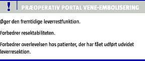 Summary Portal vein embolization prior to liver surgery Ugeskr Læger 2013;175(3):120-122 Portal vein embolization is performed with the intention to occlude the portal veins to liver segments with malignancies and direct the portal flow to the healthy part (usually the left lobe) of the liver. Thus, hyperperfusion through the non-embolized part of the liver will create hyperplasia and hyperfunction, which allow extensive liverresection at a later stage in patients where it otherwise would have been contraindictory to operate because of too small volume of the residual liver.