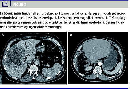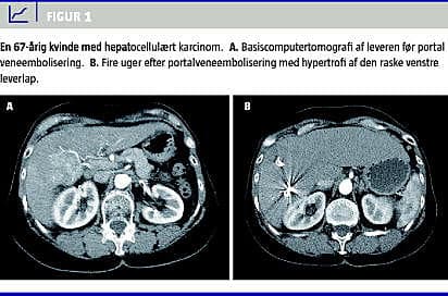 Den optimale behandling af patienter med malign sygdom i leveren er kurativt intenderet radikal resektion. Ved resektion skal der efterlades mindst 25% fungerende levervæv, for at leverinsufficiens kan undgås [1]. Selv om leveren har stor regenerationskapacitet, som påvist i dyreeksperimentelle studier, hvor man har reseceret leveren op til ni gange, uden at regenerationskapaciteten er blevet kompromitteret [1], vil den fremtidige leverrest (FLR) af og til være for lille til at kunne klare sufficient leverfunktion. Portal vene-embolisering (PVE) er en interventionsradiologisk behandling, der har til formål præoperativt at embolisere det portale kredsløb til leversegmenter med malignitet og derved ophæve den portale gennemblødning i disse og omdirigere den portale gennemstrømning til de raske og ikkeemboliserede segmenter. Herved opnås der hyperperfusion gennem den resterende uafficerede del af leveren (som regel venstre leverlap, segment 1, 2 og 3), og der opnås hypertrofi og øget volumen på omkring 30% af denne FLR [2, 3] (Figur 1 A + B). Dette muliggør ekstensiv leverresektion hos patienter, hvor der ellers var kontraindikation pga. af for lille leverrest [1]. PVE opfølges almindeligvis 3-6 uger senere af kirurgisk udvidet leverresektion af de tumorafficerede leversegmenter (almindeligvis højresidig hemihepatektomi med eller uden resektion af segment 4) på et tidspunkt, hvor den hypertrofierede leverlap har tilstrækkelig kapacitet til en sufficient leverfunktion [3]. Efter leverresektionen vil FLR yderligere kunne hypertrofiere med op til 38% [3] (Figur 2 A + B). PVE blev introduceret af Kinoshita et al i 1986 [4].