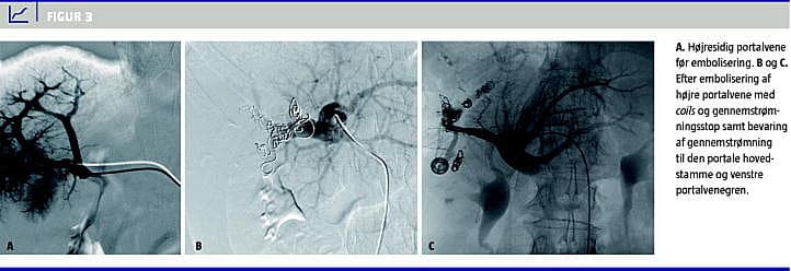 Ofte kan PVE gennemføres under sedering og i morfinrus med lokal analgesi på punkturstedet, men af og til vil generel anæstesi være nødvendig. Forud for indgrebet skal der foreligge normale trombocyttal og international normalized ratio inden for normalområdet. Adgang til portalvenesystemet foretages ved perkutan punktur under kombineret ultralyd- og røntgengennemlysningsvejledning (evt. CT-vejledning) og kateterisering af en central portalvenegren [12]. Oftest vil det dreje sig om højresidig PVE med eller uden embolisering af segment 4. Når adgangen til portalvenesystemet er etableret, indlægges en sheath og herigennem et kateter, og portalveneangiografi udføres i relevante projektioner (Figur 3 A). Emboliseringen foretages under røntgengennemlysningsvejledning. I princippet kan alle emboliseringsmaterialer anvendes, men det anbefales at anvende enten mikropartikler til embolisering af de perifere portalvenegrene efterfulgt af coils til proksimal embolisering (Figur 3 B + C) eller en blanding af n-butyl-cyanoacrylat (NBCA) og ioderet olie (lipoidol) [13-15]. Forskellige emboliseringsmaterialer til PVE har været evalueret i griseforsøg. NBCA og 50-150 mikrometer polyvinylalkoholpartikler blev fundet at give signifikant bedre embolisering og fibrosering ved patologisk undersøgelse end de øvrige testede emboliseringsmaterialer [15]. Andre har beskrevet god klinisk succes med anvendelse af vascular plugs med lav morbiditet og god vækst af FLR [16]. Temporært virkende emboliseringsmateriale som spongostan resulterer i dårligere hypertrofi end brug af permanente emboliseringsmaterialer, og ingen emboliseringsmaterialer har udvist hepatotoksicitet i dyreforsøg [17].