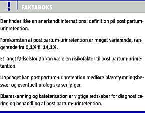 Post partum-urinretention forekommer hos 0,1-14,1% af barselskvinder. Forskellige forhold under graviditet og fødsel disponerer til postpartum urinretention, og uerkendt kan det medføre besværet blæretømning og mulige urologiske senfølger. Baseret på en gennemgang af litteratur publiceret i perioden 1980-2008 foreslås en algoritme til håndtering af postpartum urinretention.