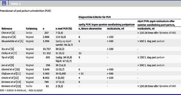 International Continence Society (ICS) definerer urinretention hos ikkegravide som en tilstand med smertefuld, palpabel blære, når patienten er ude af stand til at lade vandet, men har ingen særlig definition af PUR [14]. Akut retention defineres som en tilstand hos voksne, der ikke inden for 12 timer kan lade vandet, og som ved kateterisation tømmes for et residualurinvolumen (RV), der er større end den funktionelle blærekapacitet [15]. Eftersom den funktionelle blærekapacitet sjældent kendes hos patienter med akut retention, har definitionen begrænset klinisk relevans. Mange anvender begreberne synlig henholdsvis skjult PUR. Synlig PUR defineres som manglende spontan vandladning 6-12 timer efter vaginal fødsel eller - ved sectio - mere end seks timer efter fjernelse af kateter [2, 7, 8] (Tabel 1 ). Skjult PUR defineres som RV på mere end 150 ml efter spontan vandladning [3, 5, 7-9] (Tabel 1).