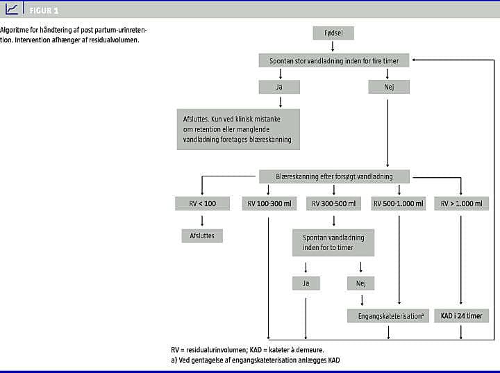 En algoritme for observation af vandladningen post partum og relevant intervention kan formentlig forebygge de fleste komplikationer til PUR. En sådan algoritme er vanskelig at udforme, bl.a. fordi der skal handles både ved manglende vandladning i en vis tid efter fødslen og ved signifikant øget RV efter vandladning. Hos ikkegravide er timediuresen 50-60 ml [37]. Normalværdier for timediuresen i post partumperioden kendes ikke, men overstiger for de fleste kvinder formentlig ikke 150 ml. Hytten & Klopper undersøgte urinudskillelsen i hvile for en række gravide kvinder, der forud for undersøgelsen drak én liter væske. Trods stor variation fandt de, at hovedparten havde en timediurese på langt under 960 ml, der er den gennemsnitlige timediurese hos ikke gravide efter en liters væskebelastning [38]. Foranlediget af de mekaniske forhold tømmes blæren formentlig helt eller delvist under fødslen. Der foreligger dog ingen studier af, hvad blæren maksimalt kan indeholde under og lige efter fødsel. Forudsat en generel øget blærekapacitet i postpartumperioden anbefaler vi at afvente spontan vandladning i op til fire timer efter fødsel, Figur 1 . Ved klinisk mistanke om retention før end fire timer, skal kvinden blæreskannes. Den nøjere sammenhæng mellem størrelsen af RV og behovet for kateterisation i post partum-perioden kendes ikke, men såfremt RV < 750 ml, er en enkelt kateterisation ofte tilstrækkelig [6, 21]. Vi foreslår at definere PUR som forekomsten af RV > 500 ml. Ved RV > 500 ml foreslår vi engangskateterisation eller kateter à demeure (KAD). Sædvanligvis vælges engangskateterisation, idet der efter 24 timer med KAD er op til 50% med bakteriuri og 15% med symptomer på urinvejsinfektion [21, 26]. Imidlertid er det ved brug af KAD muligt for patienten at slippe fokus på vandladningen samt undgå ubehaget ved evt. gentagne kateterisationer. Vi anbefaler KAD i 24 timer, hvis RV > 1.000 ml (én måling), eller hvis kvinden engangskateteriseres mindst to gange. Ved høje værdier (RV >1.500 ml) er det formentlig en fordel, at patienten beholder kateteret i tre døgn.