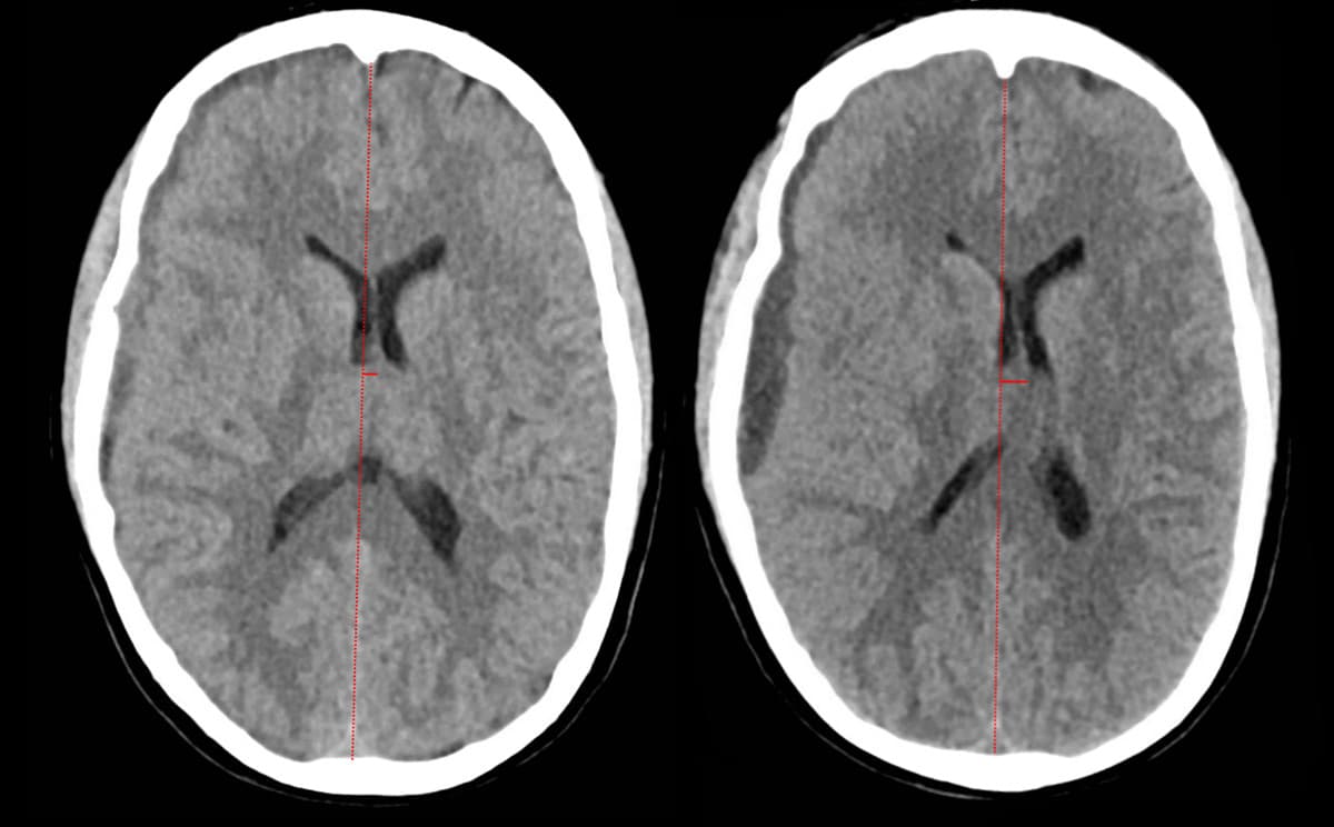En 30-årig kvinde fødte under epidural anæstesi. I efterforløbet blev hun behandlet med blood patch pga. spinal hovedpine. Efter 14 dage opstod akutte neurologiske symptomer med hovedpine, venstresidig hemiparæstesi, hemiparese, facialisparese, ordfindingsbesvær og dysartri. CT af cerebrum (CT-C) viste initialt smalt subduralt hæmatom (SDH) over højre hemisfære (A). Over to døgn progredierede symptomerne, og CT-C viste SDH med tiltagende masseeffekt (B). Patienten blev akut opereret med udtømning af SDH via borehul med efterfølgende klinisk bedring.