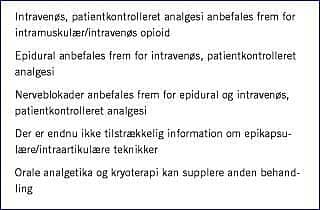 Optimal postoperativ smertebehandling bør give god/fuld analgesi med et minimum af bivirkninger/komplikationer og tillade tidlig mobilisering. Tidlig mobilisering er afgørende for at undgå forlænget indlæggelsestid og rekonvalescens [7]. Vi har derfor fundet det relevant - på basis af en litteraturgennemgang og egne erfaringer - at beskrive og vurdere de forskellige avancerede teknikker, som i dag anvendes til smertebehandling efter TKA.