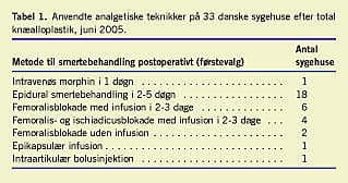 I juni 2005 blev der foretaget en telefonisk rundspørge til 33 ortopædkirurgiske afdelinger, hvor man foretager TKA i offentligt regi. Rundspørgen viste, at der i Danmark benyttes mange forskellige metoder til behandling af postoperative smerter efter TKA (Tabel 1 ). Dette kan skyldes: 1) at alle metoder er lige gode, 2) at der ikke foreligger tilstrækkelig dokumentation til, at man kan afgøre, hvilken metode der er bedst, eller 3) at den eksisterende litteratur er uoverskuelig.