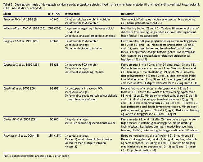 Da n. femoralis innerverer størstedelen af knæet kan en femoralisblokade eller en tre i en-blokade (over 20 ml injektion) give god analgesi. Efterfølgende infusion af lokalanalgetikum via femoraliskateter giver mulighed for forlængelse af blokaden og patientkontrolleret regional analgesi (PCRA). I to ublindede undersøgelser blev hhv. 56 og 45 patienter randomiseret til postoperativ epidural smertebehandling, kontinuerlig infusion via femoraliskateter eller i.v. PCA. Konklusionen var, at begge regionale teknikker gav bedre analgesi, hurtigere mobilisering og færre opioidrelaterede bivirkninger end i.v. PCA [23-25]. Sammenlignet med epiduralanalgesi gav kontinuerlig blokade af n. femoralis tilsvarende eller bedre analgesi, lavere forekomst af urinretention, motorisk blokade og hypotension samt færre kateterrelaterede problemer [23, 25] (Tabel 2 ).