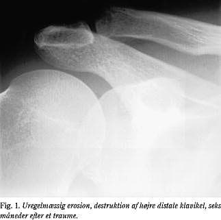 En tidligere rask 38-årig mandlig håndværker faldt på cykel og slog højre skulder. Han blev tilset på skadestuen, hvor en røntgenundersøgelse af højre skulder ikke viste fraktur. Han blev behandlet med analgetika og roligt regimen. Seks måneder efter traumet blev han henvist af egen læge på grund af intermitterende belastningssmerter i højre skulder med udstråling til højre overarm. Objektivt fandt man direkte ømhed samt let hævelse og krepitation i højre distale klavikel. Der var fri bevægelighed i skulderen, ingen tegn på instabilitet i højre akromioklavikulærled (AC-led). En røntgenundersøgelse af højre AC-led med og uden belastning viste ingen tegn på luksation i AC-leddet, men afkalkning, uregelmæssig erosion og tab af den artikulære cortex af det distale klavikel (Fig. 1 ).
