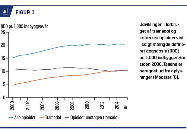 Forbruget af opioider er steget betragteligt igennem de seneste 2-3 årtier [2, 3], og Danmark indtog i 2013 en syvendeplads i International Narcotics Control Boards opgørelse [4]. I opgørelsen indgår udelukkende de opioider, der i daglig tale kaldes de »stærke« opioider. Lægemiddelstoffer som tramadol og codein, som i daglig tale kaldes »svage« opioider, indgår ikke i opgørelsen, desuden indgår buprenorphin ikke, da dette stof betragtes som en partiel agonist over for μ-receptoren. Klassifikationen stærke og svage opioider er uhensigtsmæssig, da den ofte fejlagtigt fortolkes som om, at de svage opioider er mere sikre at anvende end de stærke. I virkeligheden er det blot et spørgsmål om potens, hvor de stærke opioider er de mest potente, dvs. virksomme i mindre mængde.