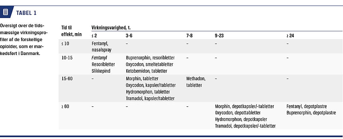 I Tabel 1 gives en oversigt over de tidsmæssige virkningsprofiler af de forskellige opioider, som er markedsført i Danmark.