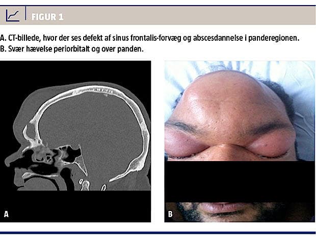 Han var febril, og der var udtalt hævelse periorbitalt samt hævelse og fluktuation i regio frontalis (Figur 1B). Der blev foretaget computerassisteret endoskopisk bihuleoperation, men da der ikke kunne skabes adgang til sinus frontalis endoskopisk pga. udtalt ostitis, valgte man at foretage ekstern drænage. Dagen efter blev der foretaget udboring til næsen gennem os frontalis’ forvæg vha. koronal incision, og hermed blev der etableret afløb.