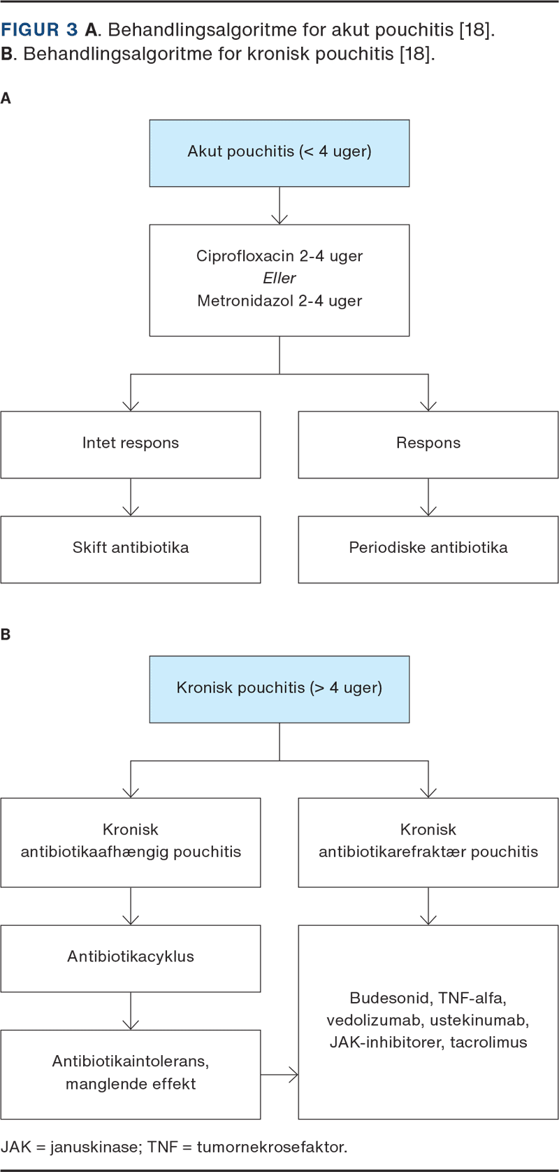 Kronisk pouchitis behandles med cyklisk antibiotika eller immunmodulerende terapi. Patienter med god effekt af biologisk behandling bør fortsætte denne behandling.