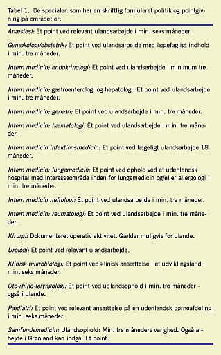 Konkret er der behov for fastere retningslinjer for vurdering af værdien af ulandsarbejde i forbindelse med udvælgelse til hoveduddannelsesstillinger. Det kunne i den forbindelse være nyttigt, hvis Sundhedsstyrelsen i samarbejde med speciallægeselskaberne formulerede klare fælles retningslinjer for meritoverførsel. Tabel 1 viser en oversigt over, hvilke selskaber der i dag anerkender lægeligt humanitært arbejde i udviklingslandene som meritgivende.