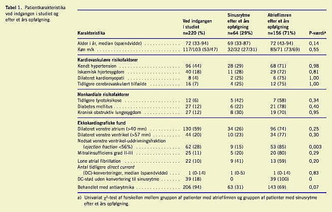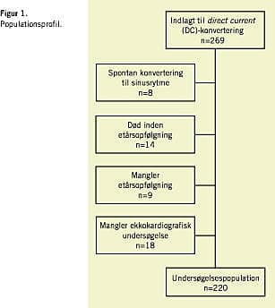 Dette studie inkluderede 220 patienter med diagnosen atrieflimren (n=215) eller atrieflagren (n=5) indlagt til DC-konver-tering på Kardiologisk-Endokrinologisk Klinik E, H:S Frederiksberg Hospital, i perioden september 1998-april 2001. Patienter med atrieflagren indgik i analysen som atrieflimren. En patient havde paroksystisk AF og blev konverteret akut. Resten af patienterne havde ved DC-konvertering diagnosen persisterende AF.