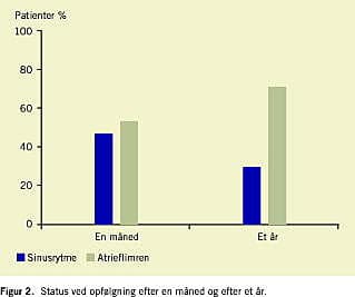 Efter en måned havde 47% af patienterne fortsat sinusrytme (Figur 2 ). Antallet faldt herefter til 29% efter et år.