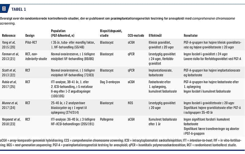 I Tabel 1 resumeres de randomiserede studier, der er publiceret om PGT-A med CCS. Fælles for de første tre studier [20-22] i tabellen er, at antallet af inkluderede patienter er relativt lille, og at patientpopulationerne er udvalgt ud fra en formodet god prognose (ung alder, normal ægreserve og/eller få tidligere mislykkede behandlinger). Resultaterne kan dermed ikke uden videre overføres til andre patientgrupper. Endvidere rapporteres og konkluderes der på resultaterne efter én oplægning af embryon(er). I ingen af studierne har man rapporteret om kumuleret fødselsrate, som er chancen for fødsel efter brug af alle embryonerne fra en ægudtagning, hvilket er det ultimative effektmål [26]. Gevinsten ved en PGT-A skal afvejes mod en behandlingsstrategi, hvor embryonerne successivt oplægges, og graviditet og fødsel er »testen« på embryonet. Frasortering af embryoner på baggrund af PGT-A vil i bedste fald (100% diagnostisk nøjagtighed og ingen skade på embryonerne) ende med den samme kumulerede fødselsrate som uden testen, men reducere antallet af behandlinger og aborter (efter oplægning af sandt aneuploide embryoner) og minimere tid til fødsel. Imod PGT-A taler, at der er en risiko for, at potentielt duelige embryoner frasorteres eller måske kan tage skade af biopsiproceduren. Popovic et al [27] fandt mosaicisme i knap 40% af de blastocyster, som blev undersøgt med NGS; endvidere fandtes der uoverensstemmelse imellem fire forskellige biopsier fra hver enkelt blastocyst. Den diagnostiske nøjagtighed blev skønnet til ca. 75%, og i 20,6% af de blastocyster, som havde normal indercellemasse, var der mindst en TE-biopsi, som viste kromosomal afvigelse, som kunne have bortdømt blastocysten.