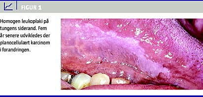 Malign udvikling i leukoplakier er i forskellige undersøgelser rapporteret til 0,1-18% af tilfældene [7]. Variationen i den procentvise maligne transformation kan formentlig forklares ved forskelle i de undersøgte populationer, varierende tobaksuvaner, forskellig observationstid og anvendelse af mere eller mindre strikte definitioner. I nyere undersøgelser fra Danmark er der påvist en malign transformationsrate på 5-10% i selekterede materialer [8]. Prognosen vurderes traditionelt på baggrund af: 1) klinisk type; de nonhomogene leukoplakier har størst malignt potentiale, 2) lokalisation; mundbund og tungens siderande/underside betragtes som risikolokalisationer og 3) histologisk undersøgelse; tilstedevæ-relsen af epiteldysplasi indikerer øget risiko for malign transformation. Man har også i nyere undersøgelser fundet, at læsionens størrelse har relation til malignitetsrisikoen, og der er endvidere sået tvivl om lokalisationens betydning, ligesom betydningen af epiteldysplasi diskuteres [8, 9]. Det er således overraskende, at kirurgisk behandlede leukoplakier, der ikke viste epiteldysplasi, udvikledes til cancer i lige så høj grad som dem, der viste epiteldysplasi [8]. Som det fremgår, er det forbundet med stor usikkerhed at forudsige en given leukoplakis maligne potentiale, og der er et stort behov for at finde molekylærbiologiske markører, der kan anvendes i den praktiske håndtering af disse patienter [7]. På trods af interessante resultater af sådanne undersøgelser [7, 10] er der ikke identificeret markører, der har fundet vej til anvendelse i den daglige rutine.
