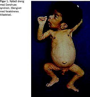 Mutationer i genet, der koder for insulinreceptoren, kan medføre insulinresistens, der viser sig som en række kliniske syndromer af varierende sværhedsgrad (type A-insulinresistens og Rabson-Mendenhall syndrom) [1, 2]. Den mest alvorlige form resulterer i Donohues syndrom (Leprechaunisme) der har et letalt forløb og medfører døden inden for de første 1-2 leveår [1, 2]. Arvegangen er autosomal recessiv med en incidens på ca. en ud af 4.000.000 fødsler. Syndromet er karakteriseret ved svær intrauterin væksthæmning, lav fødselsvægt, dårlig trivsel og hyperglykæmi som følge af alvorlig insulinresistens. Patienterne har et alfeagtigt udseende med lavtsiddende ører, nedsunket næseryg, udspilet abdomen, acanthosis nigricans, hirsutisme, manglende subkutant fedt og ringe muskelmasse [1, 2].