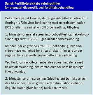 Summary Prenatal screening and diagnostics after infertility treatment Ugeskr Læger 2007;169(5):414-9 Women who get pregnant after infertility treatment differ from women with naturally conceived pregnancies concerning prenatal screening: on average they are older and therefore they have a greater risk of carrying a child with Down's syndrome, their children have an increased risk of congenital malformations, and they have a great wish to avoid invasive prenatal diagnostic tests. The conclusion of this review is that first trimester screening is an acceptable choice for these women, although larger studies are needed to clarify whether a correction factor is necessary for the biochemical markers.